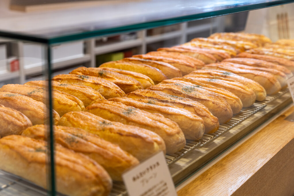 福太郎はパン作りのために⾃社⼯房までつくり、このめんたいフランスが⽣まれました。